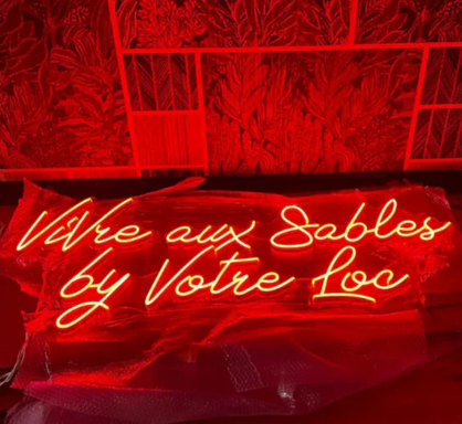 Nos enseignes néon standard sont conçues pour une utilisation intérieure. Pour une utilisation en extérieur, nous proposons des options résistantes aux intempéries moyennant un supplément.